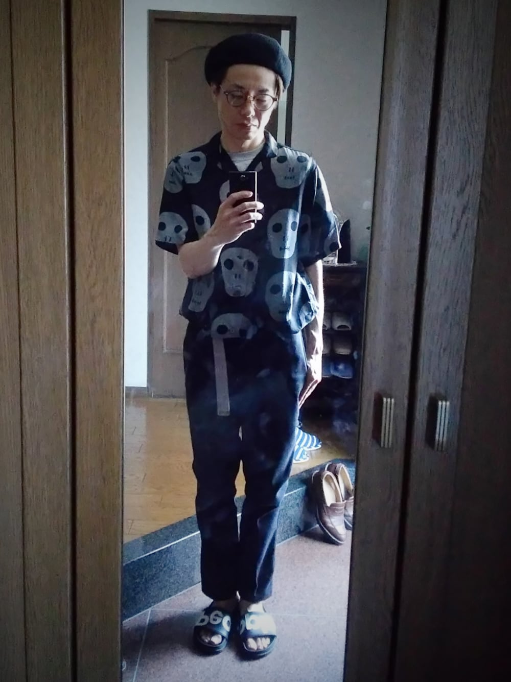 お間抜け顔の骸骨くんがなんともいえないブルーナボインの開襟シャツをタックインで。