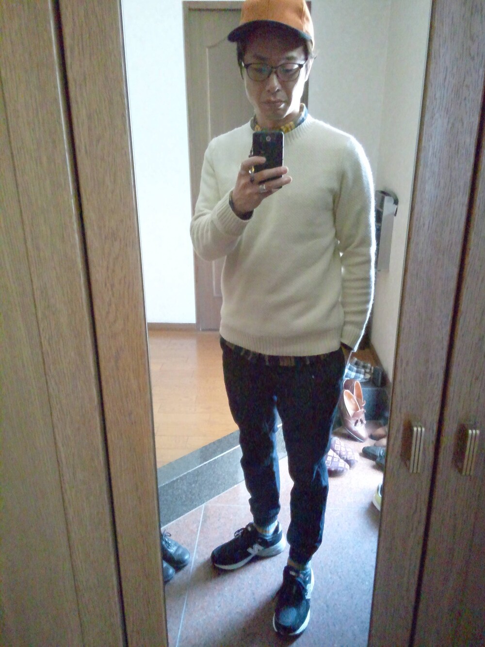 gantのベージュのニットとBEAVER別注のジョグパンでスポーツミックス! オシャレ師匠のスタイリングを頂いちゃいました(笑)