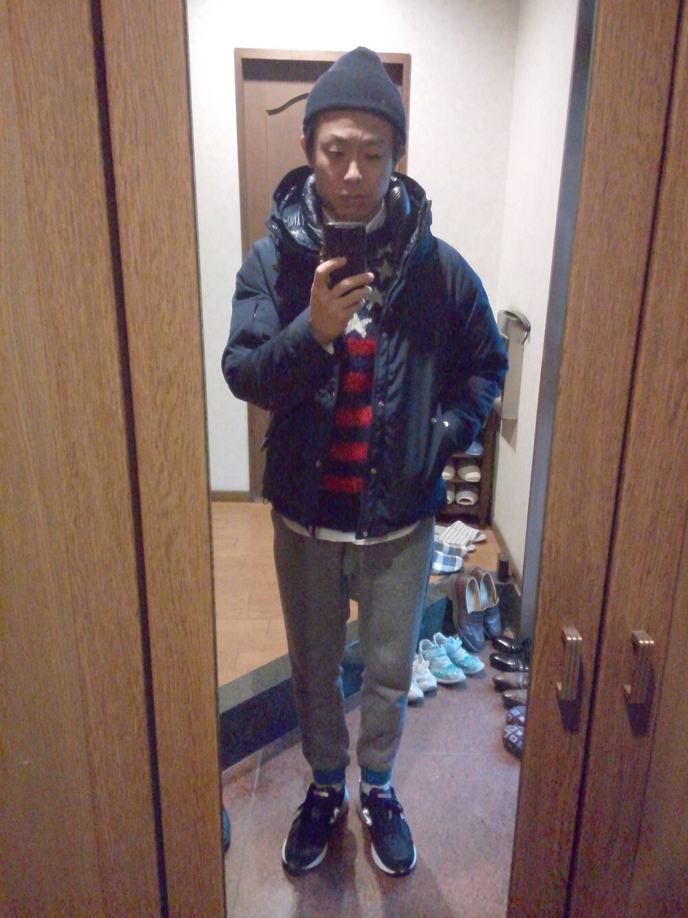 星条旗柄のモヘアニット!そのインに白シャツ、ボトムスはグレーのリブパンツを合わせてみました。
