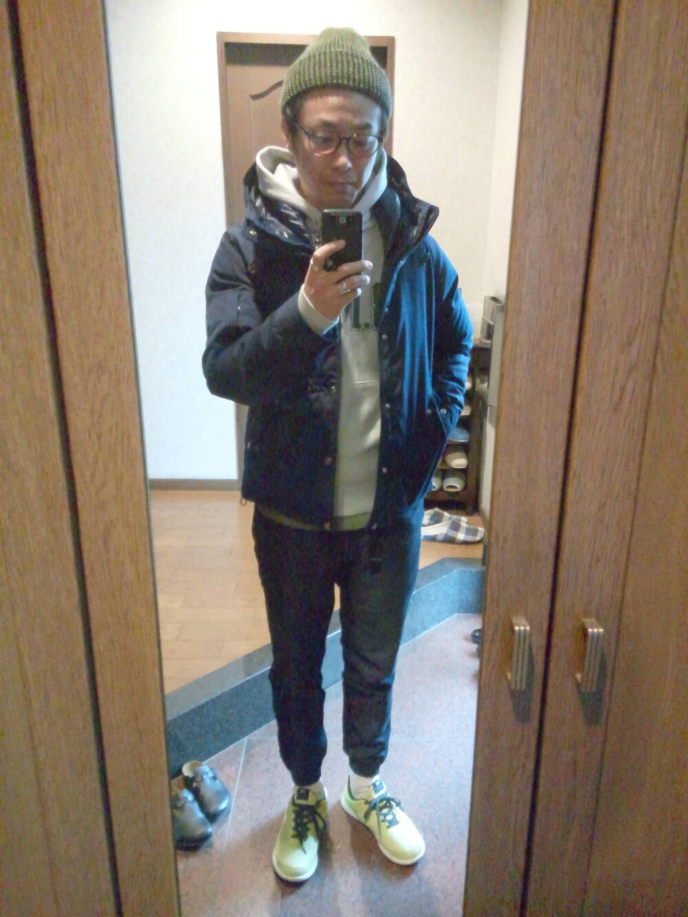 ダウンジャケットが大活躍の寒さ。 ネイビー×ネイビーのハズしにビタミンカラーのスニーカーでスポーツミックス!