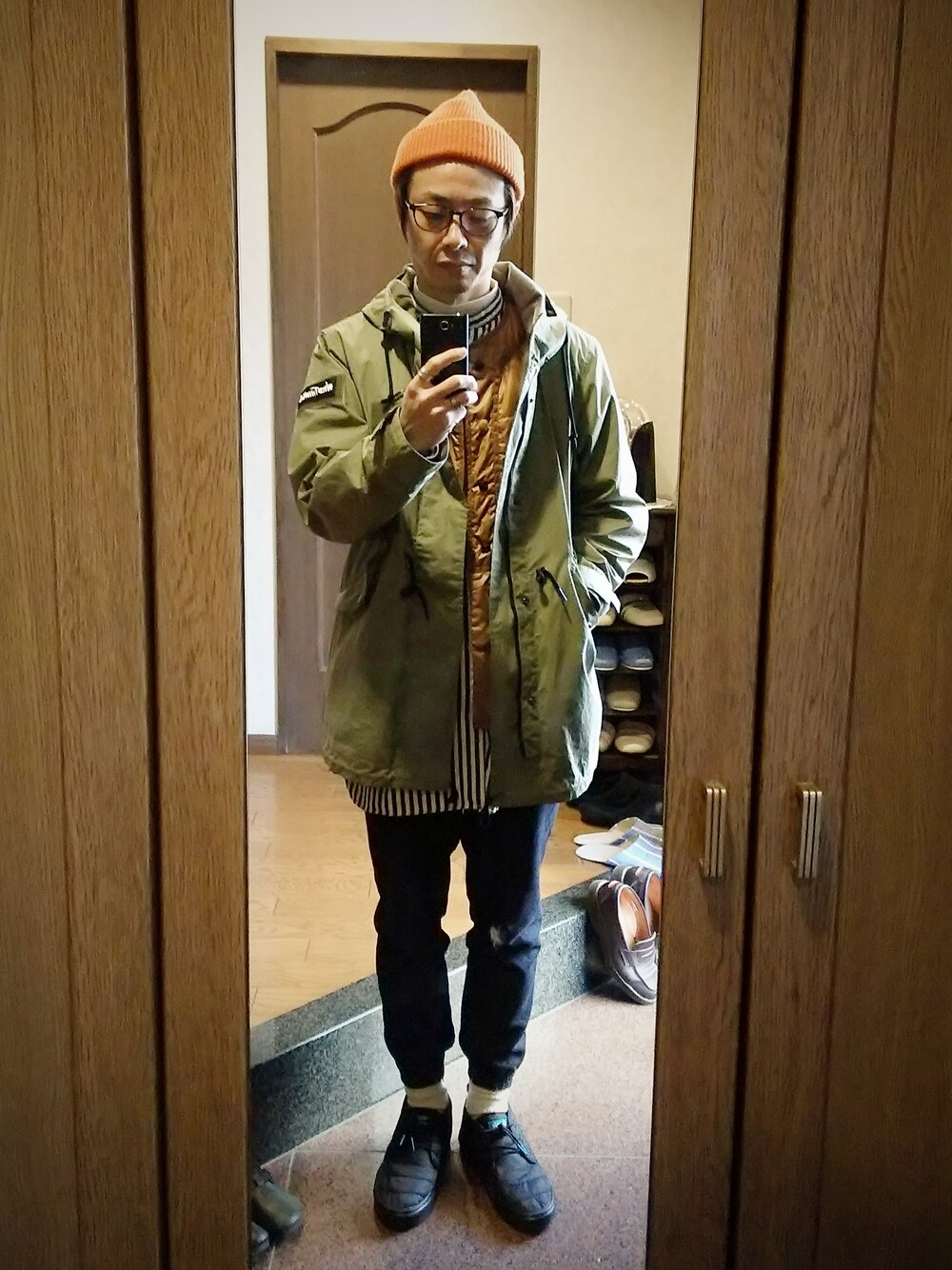モッズコートもインナーダウンで暖か! ニットキャップとインナーダウンのオレンジカラーが視覚的にも暖か☆