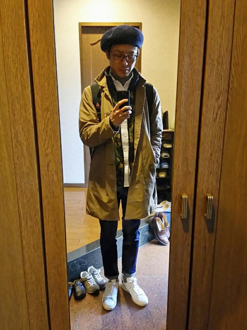 ベージュのステンカラーコートに最近お気に入りのインナーナイロンジャケット! 迷彩柄でチラリのミリタリー☆ ナイロン挟むだけで小寒い時は暖かさが全然違うのでおすすめです♪