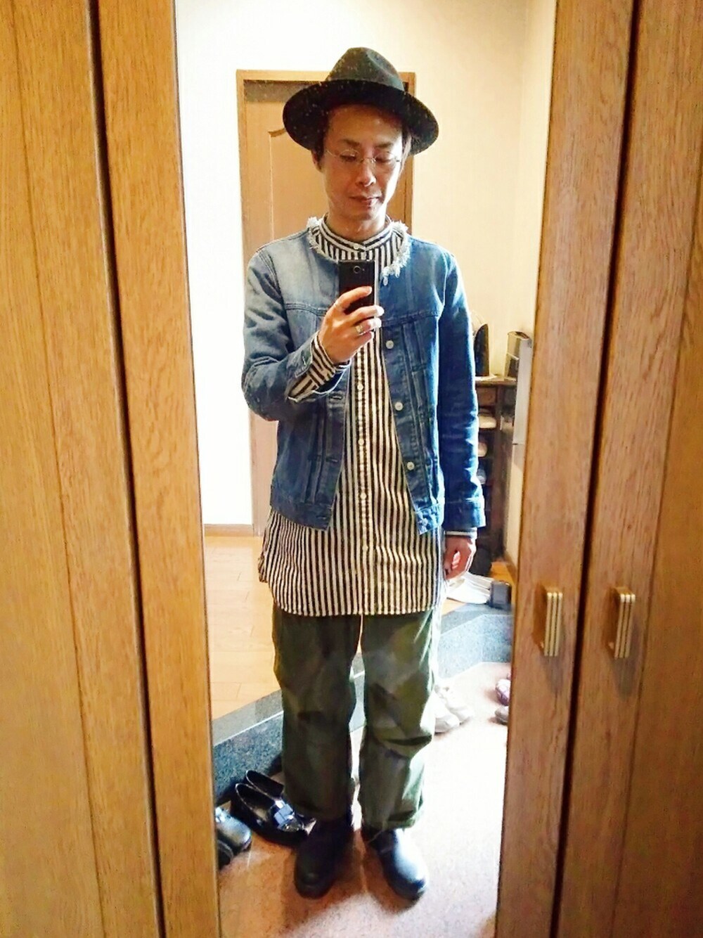 ストラップのスタンドカラーロングシャツに極太の軍パンでミリタリーミックス☆