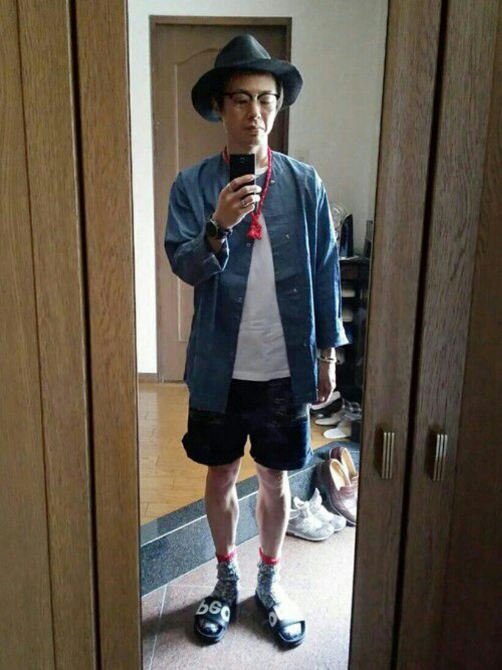 後れ馳せながらショーツ投稿。 写真では良くわかりませんが、ちょっとパジャマちっく?なシャツを法被ちっくに腕捲って着てみました。 バンダナ生地を使った赤のネックアクセサリーをワンポイントに。