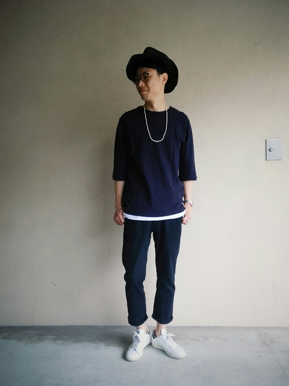 ネイビー×ブラックの濃トーンコーデ 8月も末なので袖も長めに
