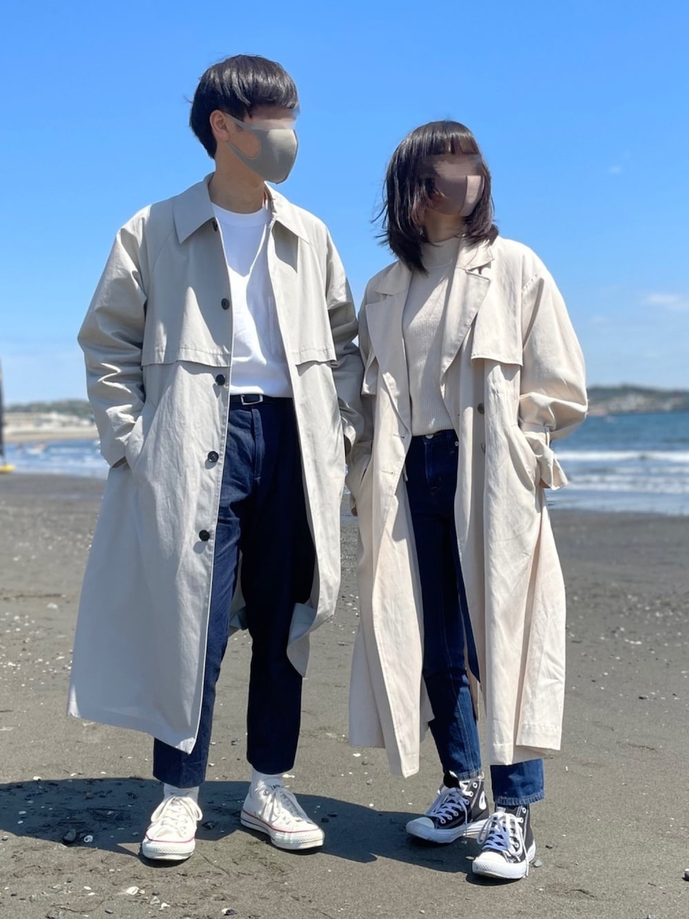 いつもいいねやお気に入りありがとうございます🐶 個人用アカウントとInstagramもやってます📷 ◾️個人用アカウント【@2ntwtk0】 ◾️Instagram【@mokolink】 そちらにもぜひ遊びに来てください🥺 ------------------------------------------------------- ✔️スプリングコート×デニム 4月も半ばになりましたがまだまだ肌寒い日もありますよね🥲 そんな日におすすめなリンクコーデです! ロングコートにデニムとスニーカーを合わせてきれいめカジュアルなコーデにしてみました! トップスもTシャツやニットでカジュアルさ強めなので、タックインしてきちんと感を演出✨脚長効果も期待できます◎ 🙋♀️はトップスを薄手のニットにしました! 薄手の物は春にも使えるので1枚持っておくと着回しがしやすくおすすめです😌 🙋♂️はUNIQLO Uのロンティーです!安定の使いやすさで、何枚あってもいいですね笑 スニーカーはコンバースですがお互い色を変えてみました! 🙋♂️のナチュラルな色は抜け感を、🙋♀️の黒はカジュアルながらも締まって見えます👀 🙋♀️:身長154cm/足22.5cm 🙋♂️:身長164cm/足26.5cm