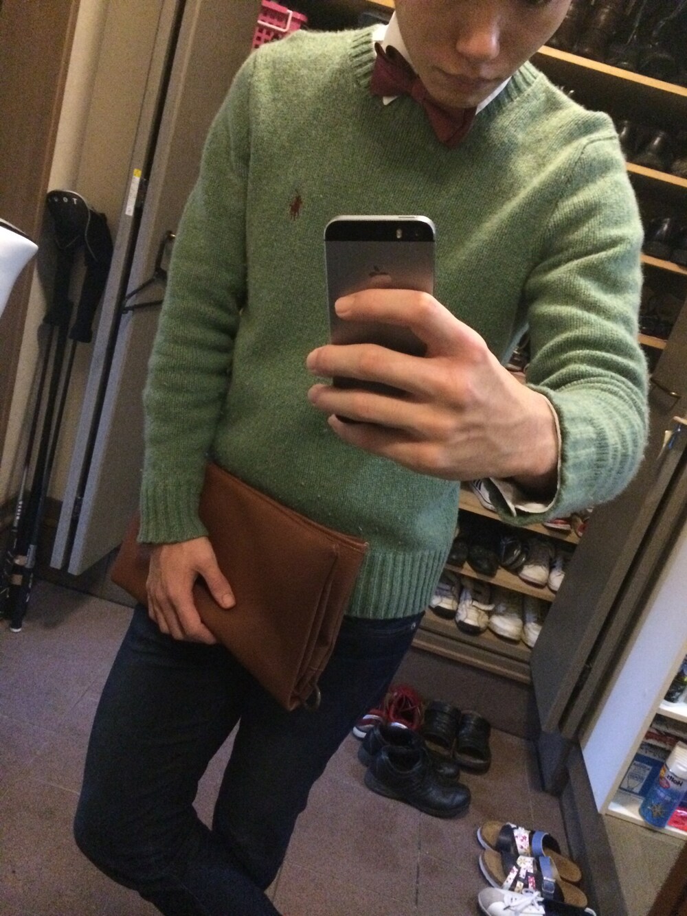 こんばんは♪ 今回は蝶ネクタイを付けて綺麗目でカジュアルにしてみました! ラルフローレンのマークや蝶ネクタイの色、バックやシューズをブラウンに合わせて統一感を合わせました! 北海道は今日は少し暖かいです👍笑
