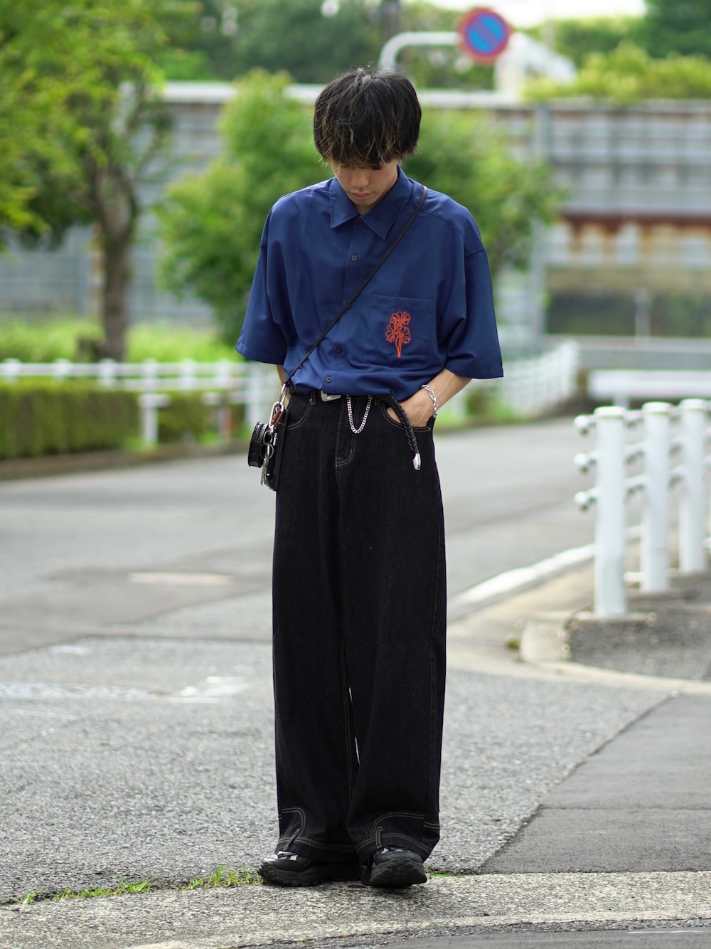 つぐ吉のシャツ/ブラウス「刺繍デザイン オーバーサイズ ドレープレギュラー半袖シャツ/刺繍 オーバーサイズレギュラーカラーシャツ」を使ったコーディネート