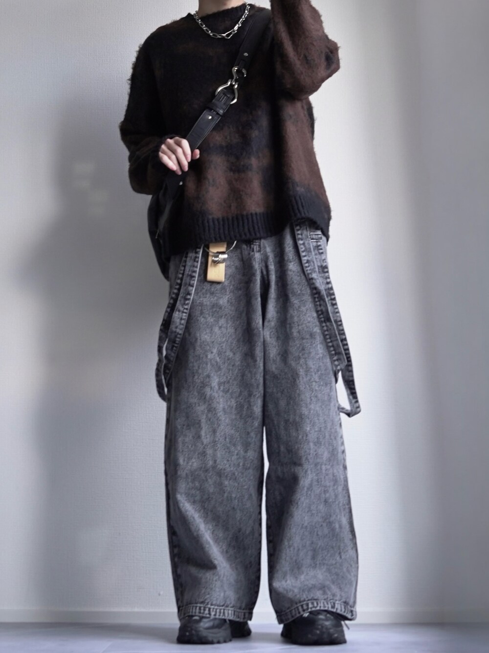 つぐ吉のニット/セーター「アブストラクトシャギーモヘアライク ルーズクルーネックニット」を使ったコーディネート