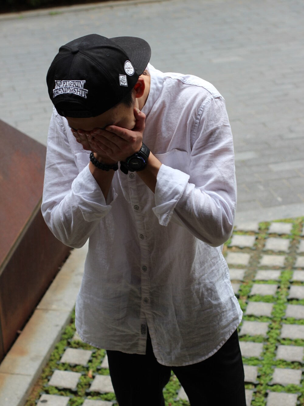 ホワイト系のシャツ/ブラウスを着用したメンズの夏コーディネートの1枚目の写真