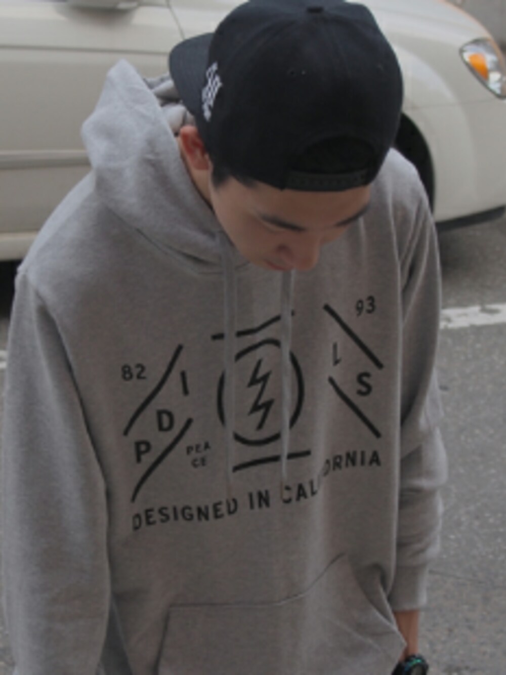 グレー系のパーカーを着用したメンズの秋コーディネートの1枚目の写真