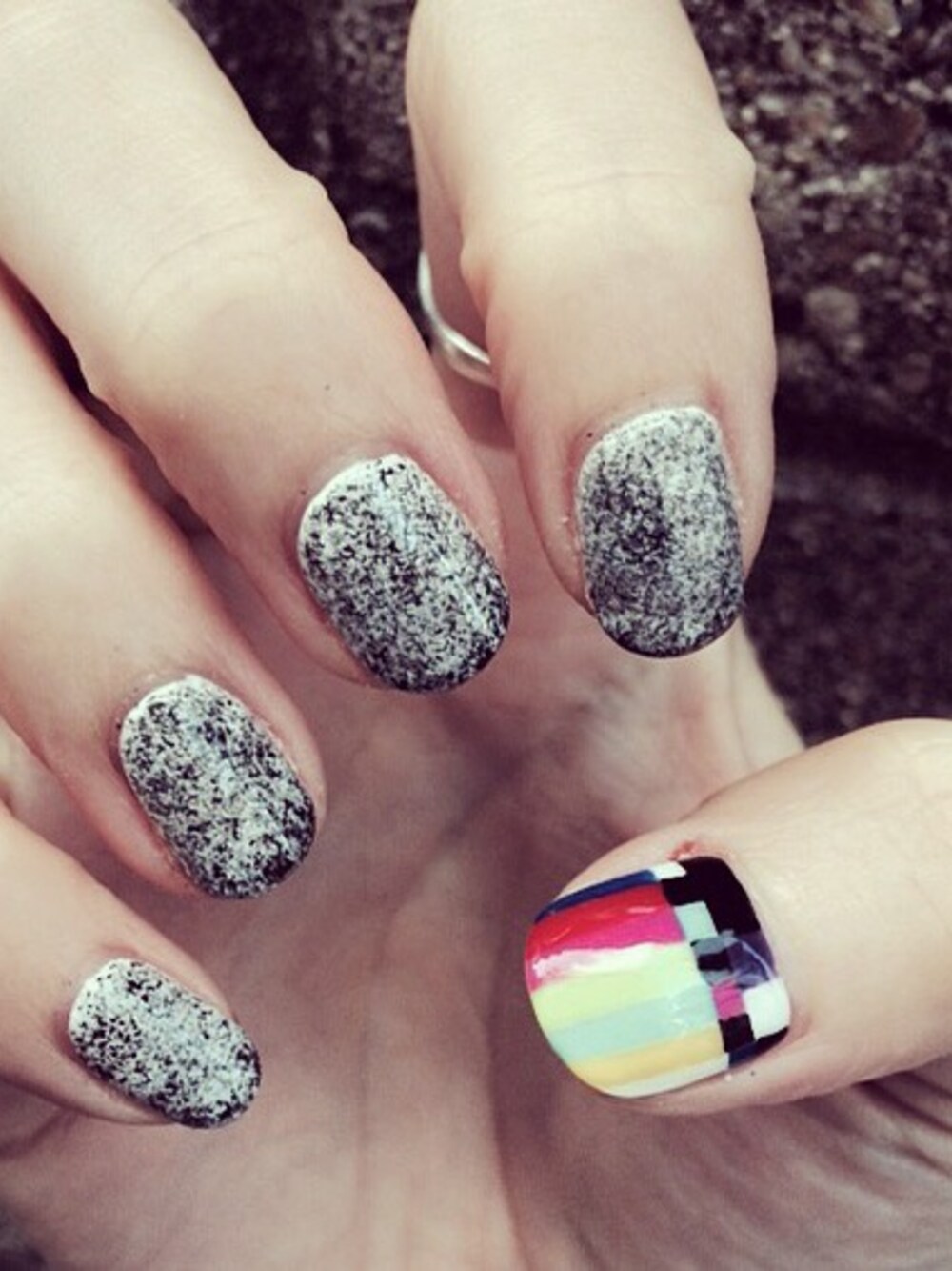 新しく塗ってもらった爪は、 深夜放送のテレビ風にカラーバーと砂嵐。 結構ぎらぎらしてて、お気に入り。