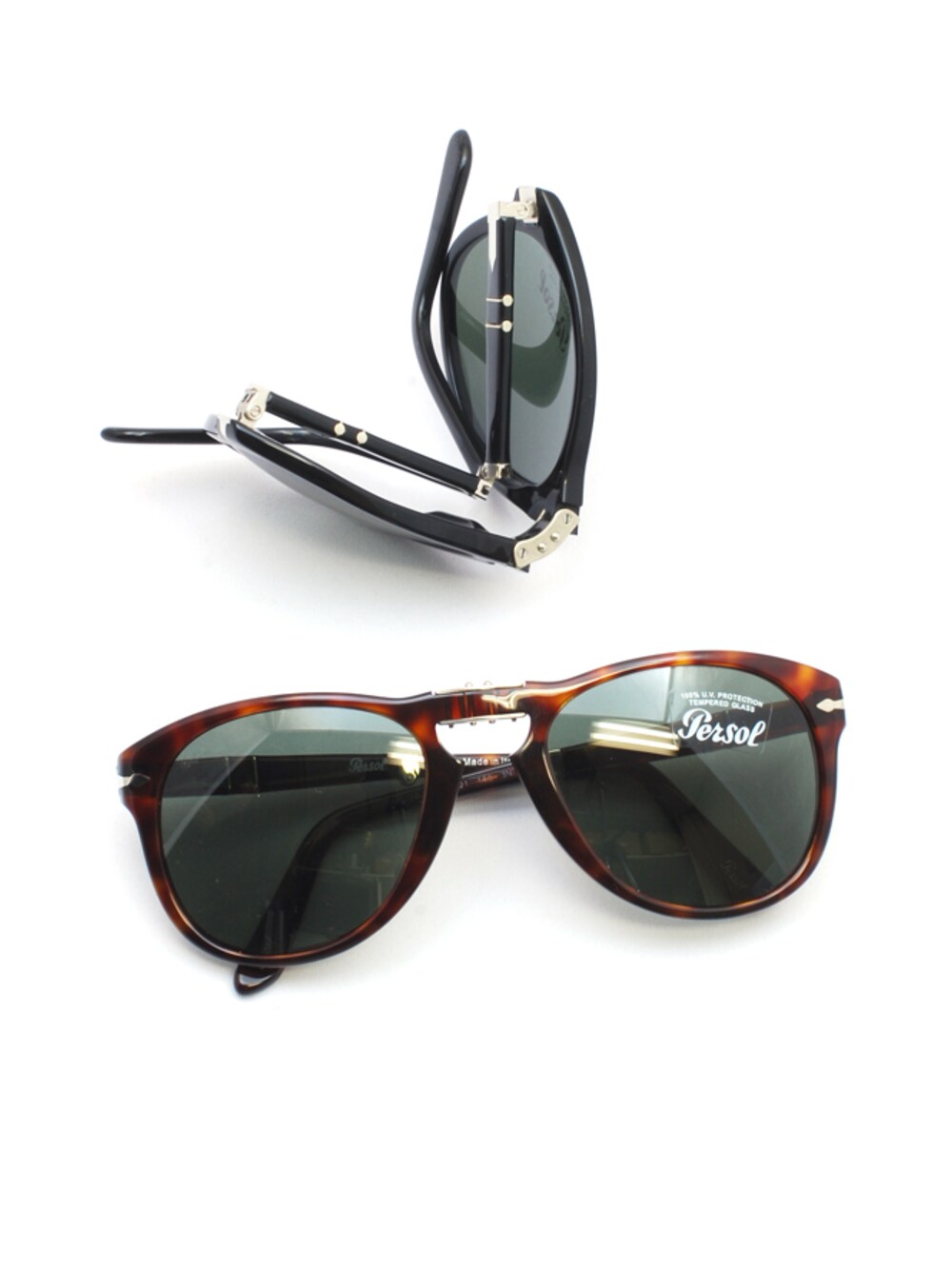 Persol "714" 1960年代に発表された、”649″ のデザインを汲んだフォールディングモデル。映画、『華麗なる賭け』の中で、スティーブ・マックイーンが掛けたことで非常に有名になりました。マックイーンは映画の中だけでなく、日常の中でもこのモデルを愛し、彼のサングラスを掛けている画像はほぼこのモデルを着用した写真です。 折り畳み可能で、Persolのみの下に曲がる独自の機構となっています。 http://klein-eyewear.com/persol