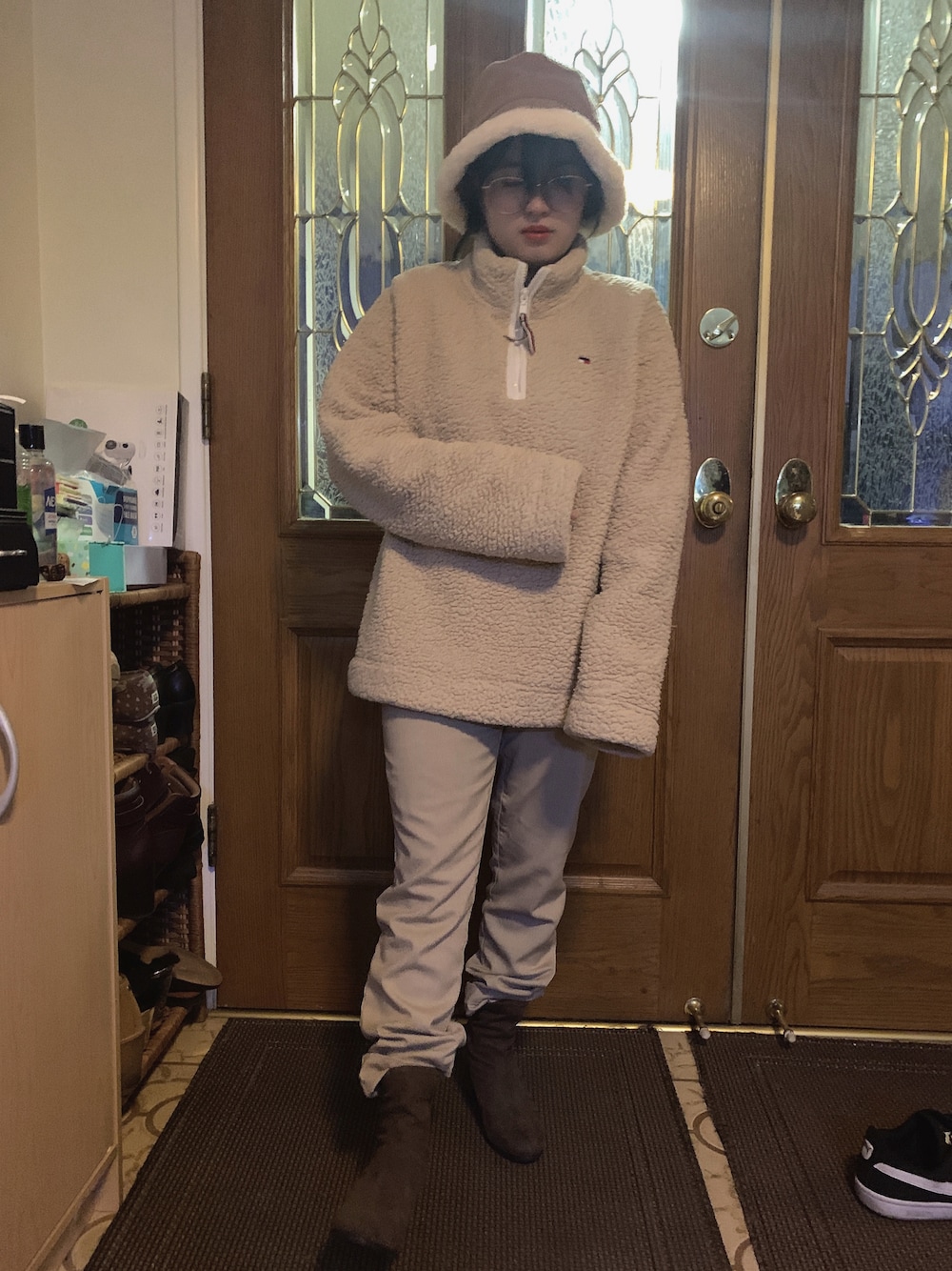 New glasses new me #2022 * ベージュの古着カジュアルが最近のお気に入りです。もこもこのバケハは中々好みなのが見つからず苦戦しました。インにしたほうが足が長く見えるのと女性らしいブーツが見えるからです。でも普段はあんまりインしません。