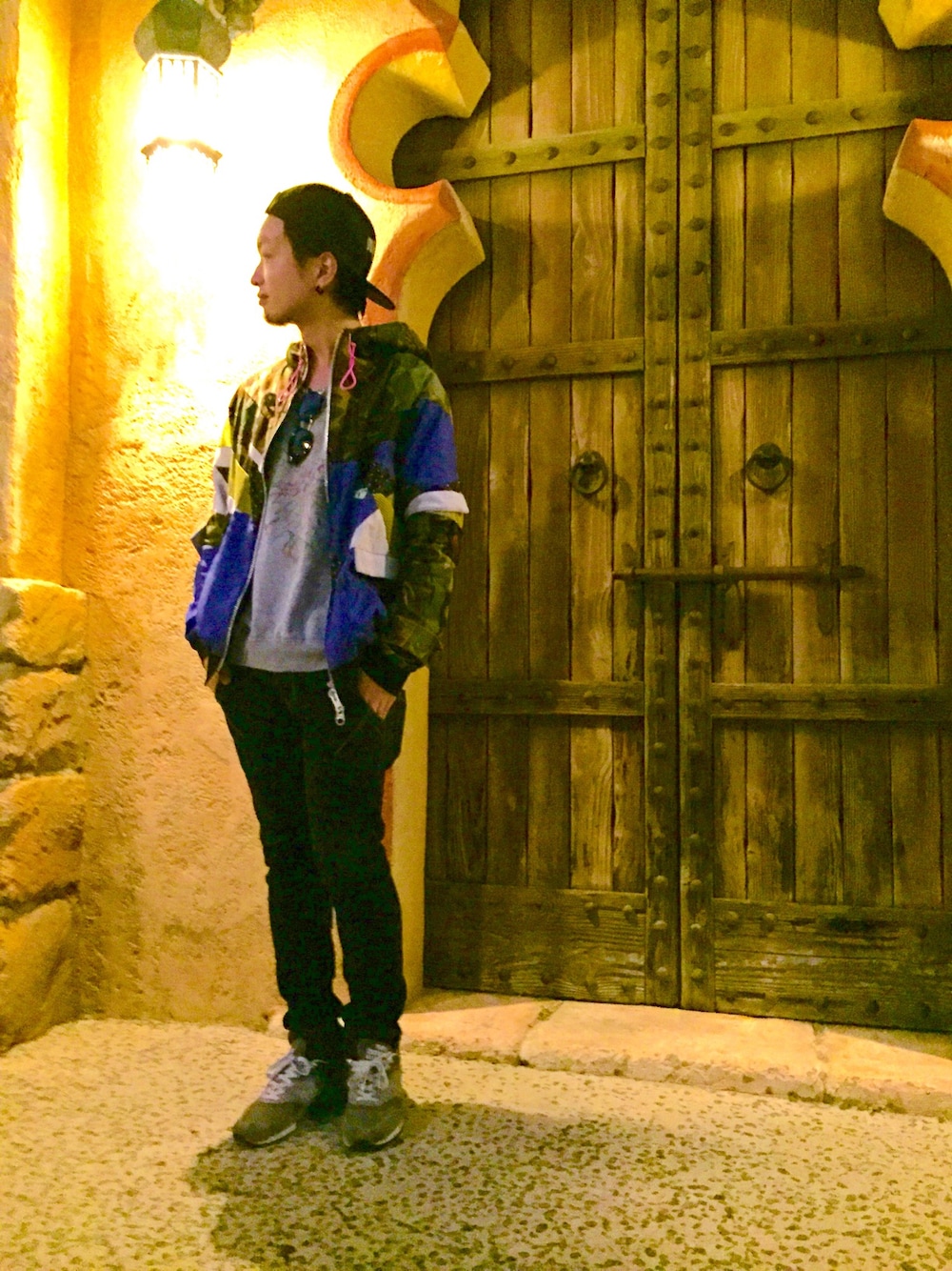 キャップとスニーカーと、とどめにVINTI ANDREWSのアウターでまとめたストリートコーデ。デザイナーの手によりNIKEのマウンテンパーカーと迷彩服、ジャージなどいろんな服の切り替えが施されて有る一点物です。このシリーズはNIKEロゴが逆さに切り替えられているのが特徴。遊び心が有って可愛いです☻