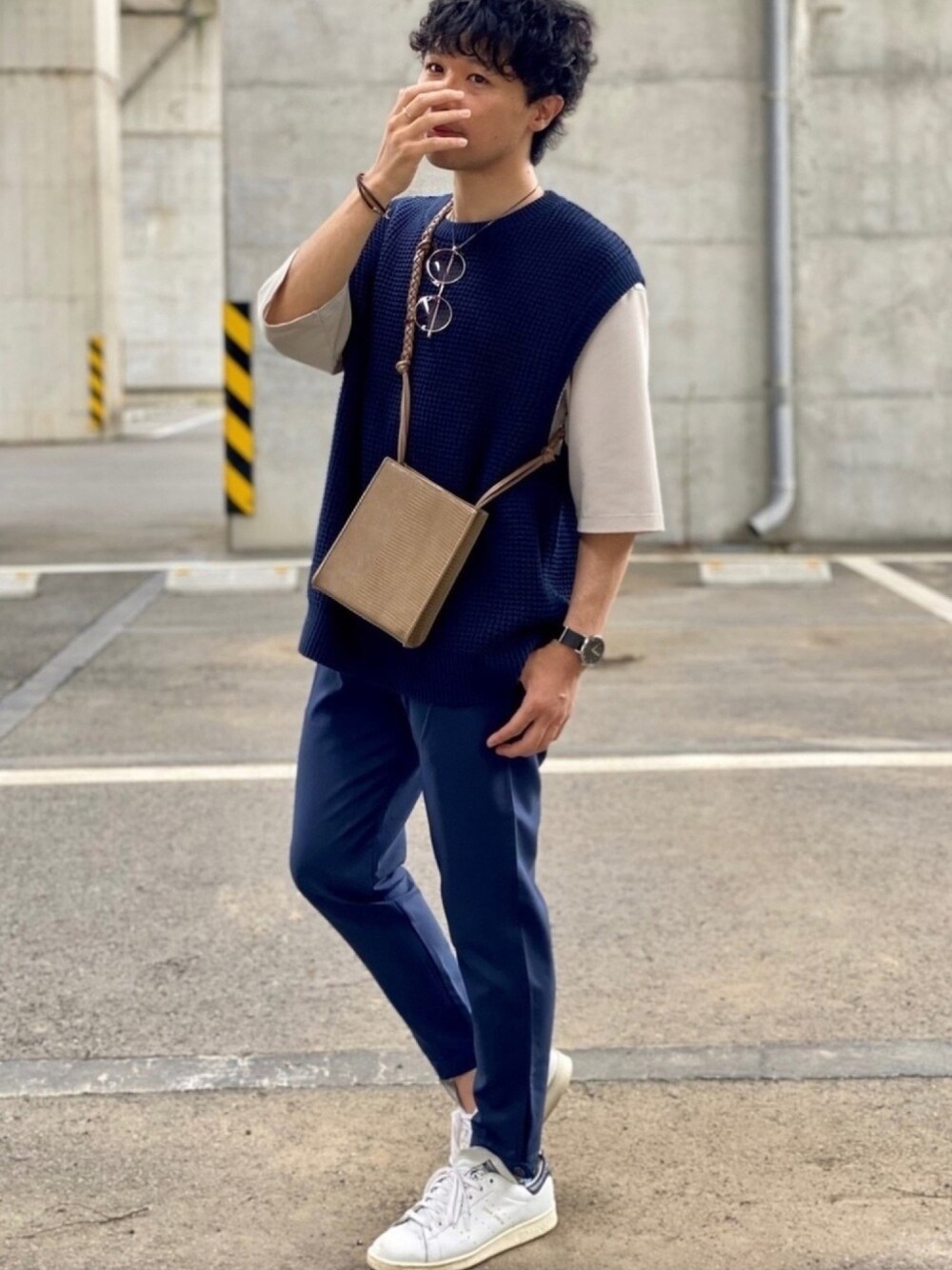ZIP FIVEのセットアップをパンツ単体で使いベストと合わせました👖 シューズはスタンスミスでカジュアルダウン👟 いつもいいね、お気に入りありがとうございます🍀
