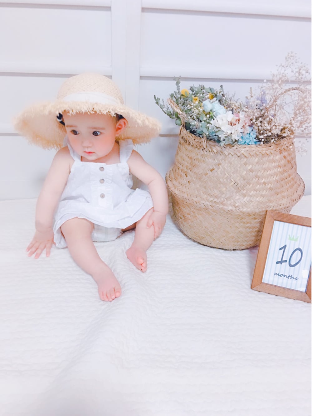 菜々瀬無事に10ヶ月を迎える事ができました♡ マンスリーフォトも完了☆ 麦わら帽子ジャストsizeあってかってしまった😅 白ワンピースに麦わら帽かわゆ💕