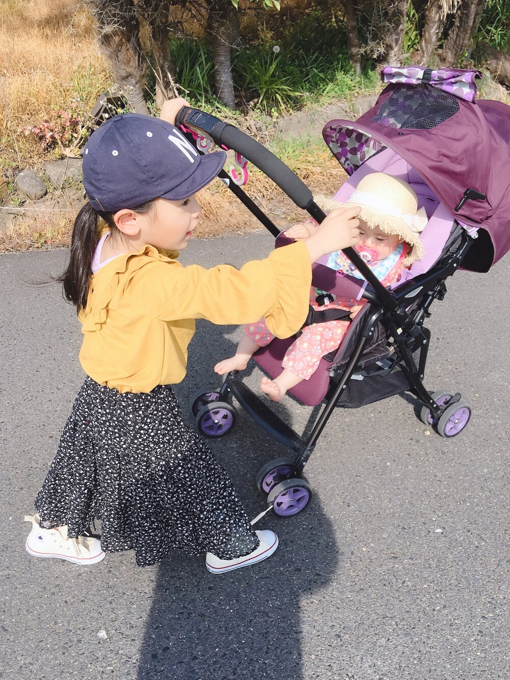 お天気良くて3人でお散歩🌞 オネェちゃんがベビーカー押してくれて楽チン⭐️ しかし暑すぎました💦
