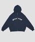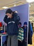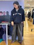 ジップフーディを着用。フロントのロゴが目を惹き、程よくゆったりとしたシルエット。 ロングコートのインナーでも使いたいし、女性の方にも着ていただきたい。