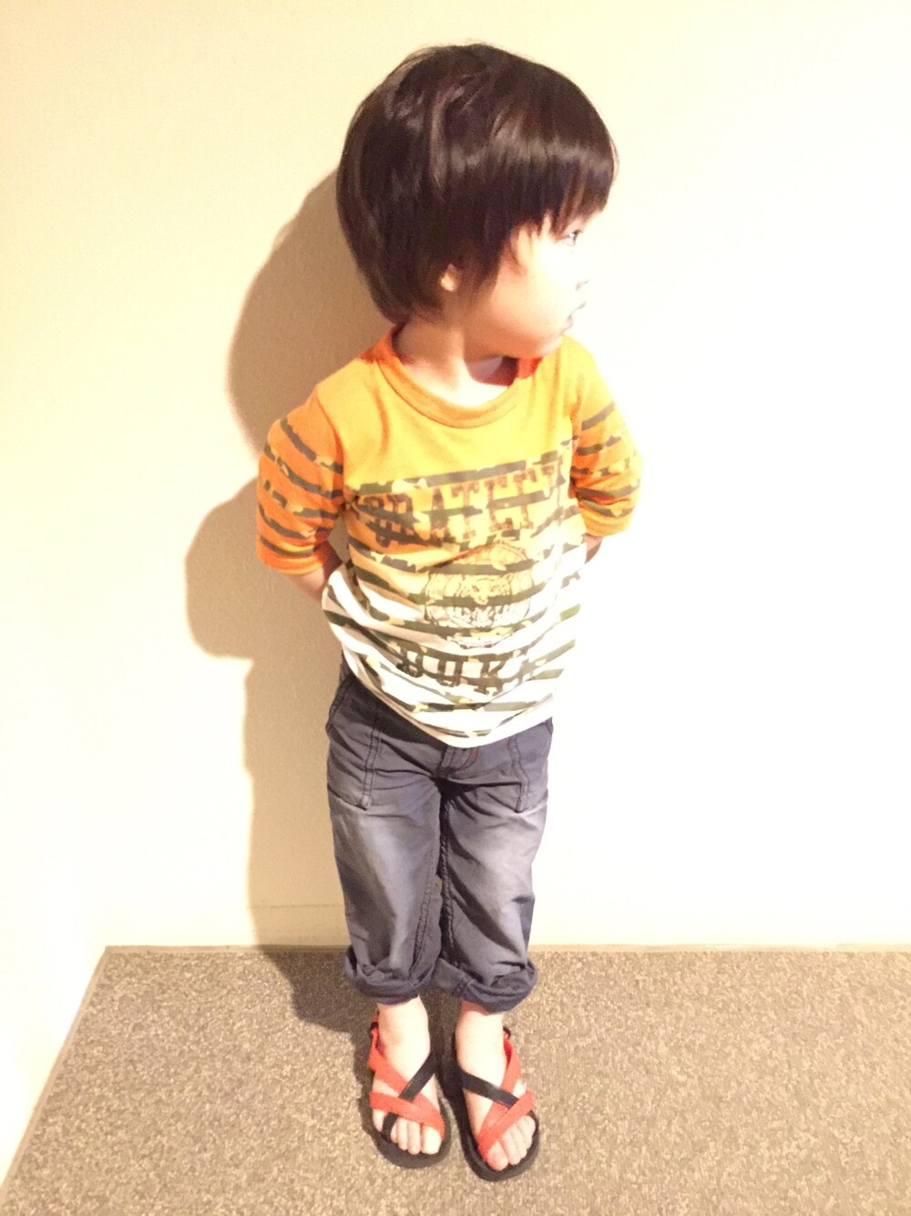 ボーダーグラデーションが気に入り購入。オレンジ色がグラデになっていて、ボーダー部分はカーキ色のカモフラ柄になっています。 この日はかなり暑かったのでビーサンを合わせて。 気付いたら全部Right-onオリジナルブランドでしたf^_^;)