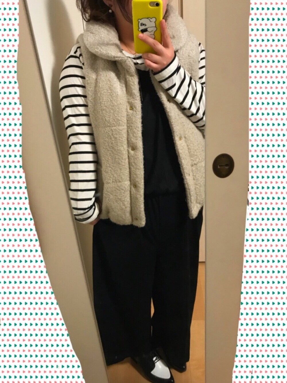 見て頂きありがとうございます🙇🏻♂️ いつもいいね、お気に入り、コメントなど励みになります😊 最近view数もイイねの数も安定して増えてきてめっちゃ嬉しー😍あとコメ貰えるようになって一人でニヤニヤしてるから旦那に怪しまれてる😅 残念体型コーデはサロペとボーダーのコンビに出番の少ない暖かベストとハンサム靴合わせたらどーやろか?の巻。 前回に引き続き通販フェリシモの服(あ、ボーダーとサロペのセットがそれです)嬉しそうに着てみる。そして靴は着回しっす笑 サイズどーかなぁ?と思いつつ大きいのをドキドキしながら買ったサロペは想像より上半身の長さ、幅にゆとりあって通販の画像みたいにブラウジングが見える感じで着たら長くて無理で、、でも着る!可愛いのは可愛い!似合ってなくても着ます!笑 でももうワンサイズ小さくしたら多分ボーダートップスがピチるかなぁと、、、難しい体型です😥下半身の肉もさながら上半身がマジでボンレスハムなんで、、、痩せろよ自分😭頑張ろっ😫