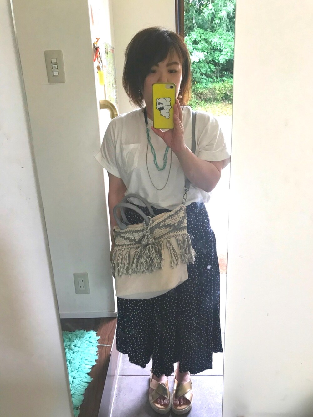 みて頂きありがとうございます🙇🏻♀️ いいねやお気に入りコメントなどしていただけていつも喜んどります😋 台風だー!!! 小学校が警報で休みなので私も今日はお休みです💓 3連休やっほー😆✨✨ 昨日は警報のお陰様で給食が早出しになり、元々忙しいメニューやったのにさらに慌ただしくなってもう朝からずっとバタバタで久々に半泣きになりながら仕事したけど何とかなったのでまた1つ自信になりました👍 スタッフ間の問題が只今勃発中でして上の身として胃が痛いです🙄 でも体調の方は体重の減りが止まって増えてきたということで良くなってる様です😦💦 運動頑張らないと!!あと食べる量気を付けないと😱😱 そんな残念体型に拍車がかかってきたコーデ。 天気が良かった日でした。 白トップスにドットガウチョ。 トップスイン苦手なんやけどやってみた。 カバンはこの前セールでゲットしました😍お気に入り💓 あとサンダルとスニーカー欲しい!! この前行ったセールでは義理の妹の誕生日プレゼント買うのに必死でセールあんまり堪能出来んかったからもっかい行ってセール満喫したいーー🙄🙄💓