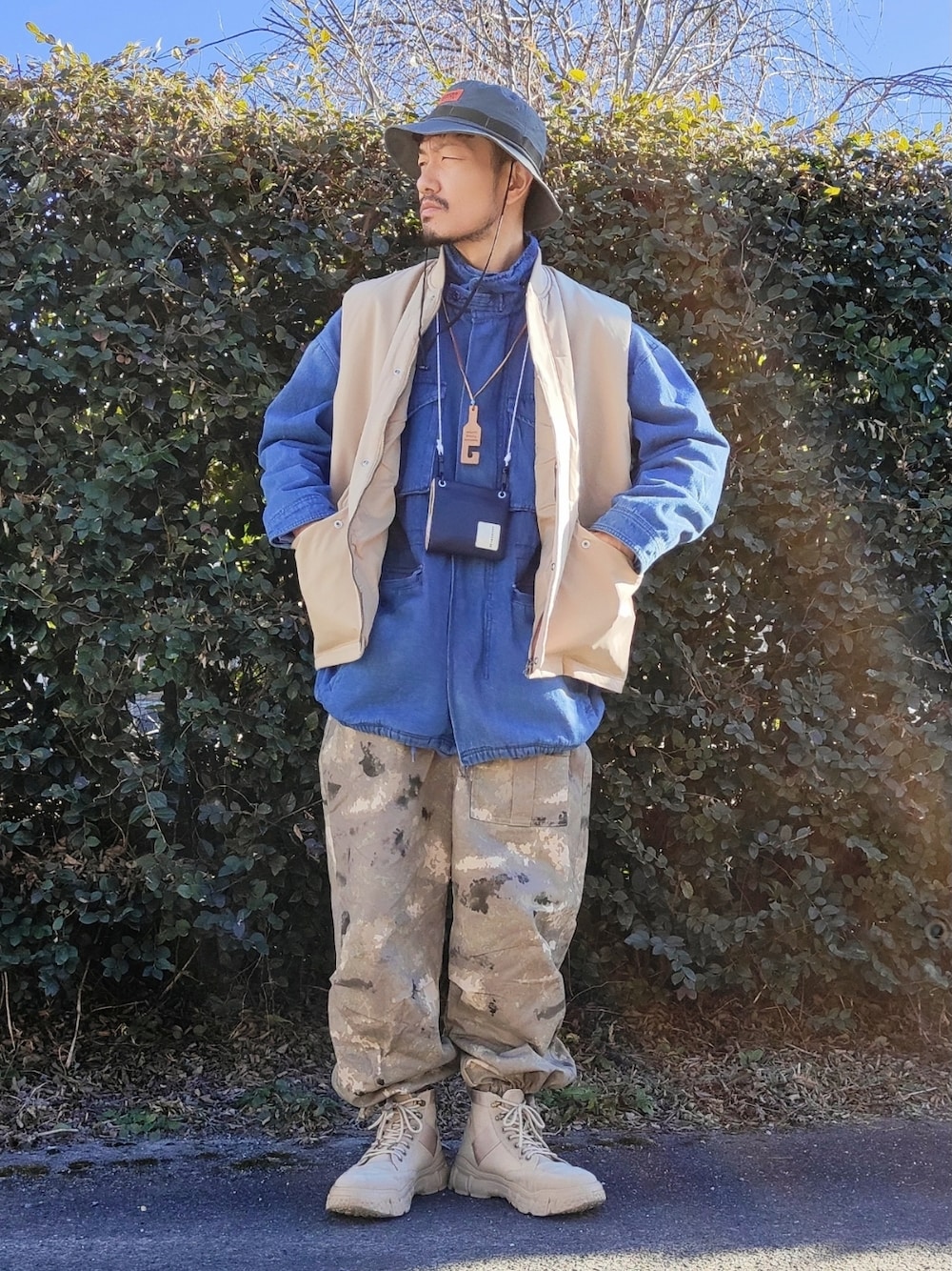 どーも✋ 迷彩カーゴパンツとZIP FIVEのデニムジャケットにSPOC STOREのベストをレイヤードしてストリートコーデです🛹 アウトドアなストリートスタイル😙