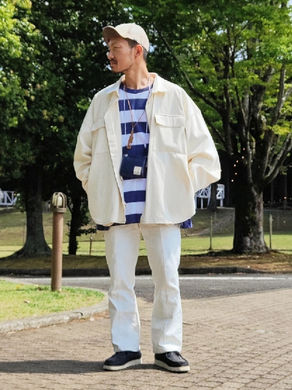 どーも✋ NilwayのデニムフレアパンツとNylausのシャツジャケットにUNIQLOのボーダーTシャツをレイヤードしてきれいめストリートコーデです♪ 淡色とボーダーでさわやかにきれいめカジュアル☺