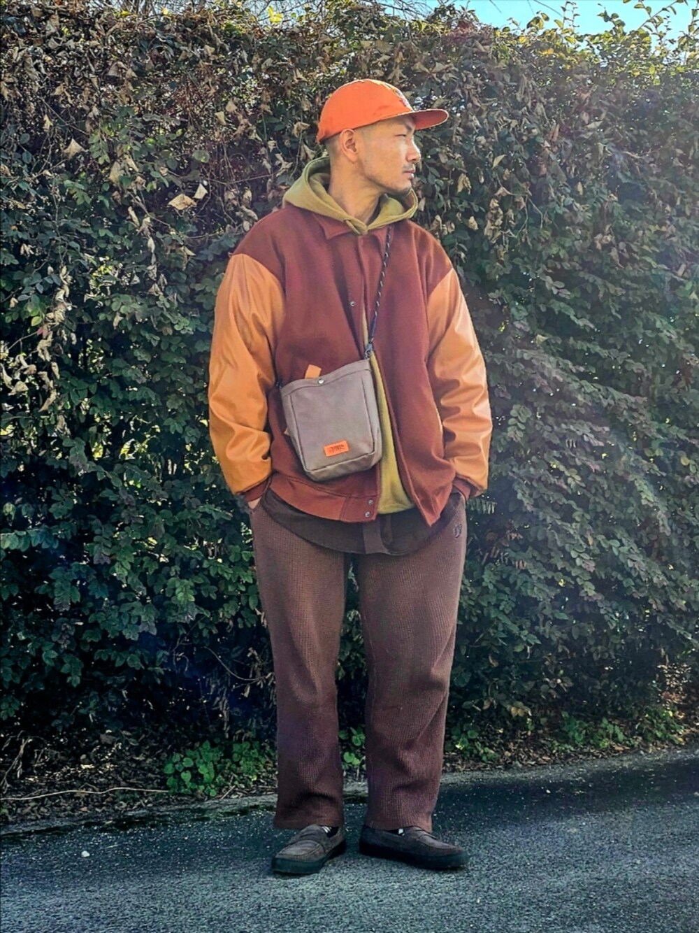 どーも✋ WHO'S WHO galleryのワッフルパンツとkutirのスタジャンに、インナーはZIP FIVEのパーカーにCORISCOのシャツをレイヤードしてストリートコーデです🛹 ブラウンベースのオレンジアクセント😉