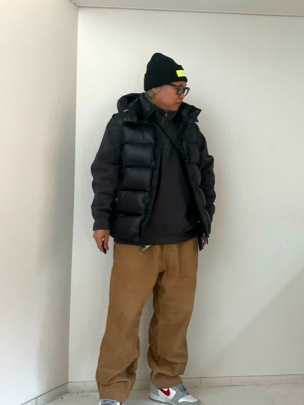 TATRASのダウンベストとコーディロイのペインターパンツを合わせたコーディネート
