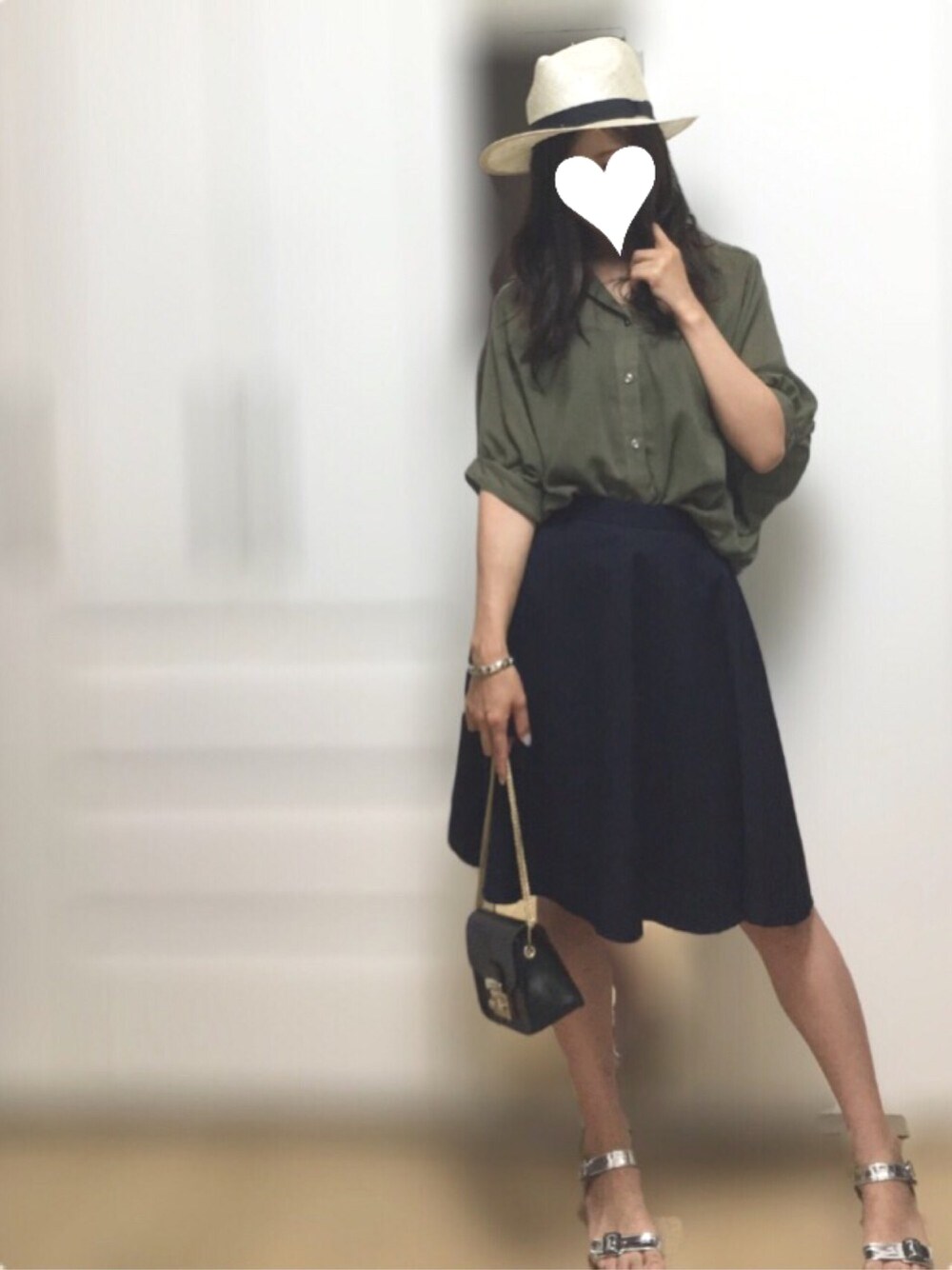 いつも見ていただきありがとうございます(^-^) 今日はカーキ×ネイビーのコーディネートです! シルバーサンダルを差し色に♫ visのネイビーのスカートはフォーマルスタイルにも使っていますが、今回はカジュアルにしてみました(^-^)