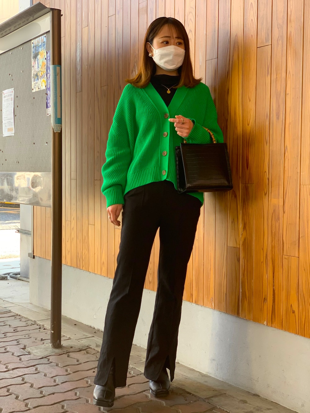 大人春コーデ🌸 UNITED ARROWSの緑のニットが可愛すぎる💚 厚みがあるので中は薄着でも暖かめ! beamsのバッグもたくさん入るし可愛すぎ👜