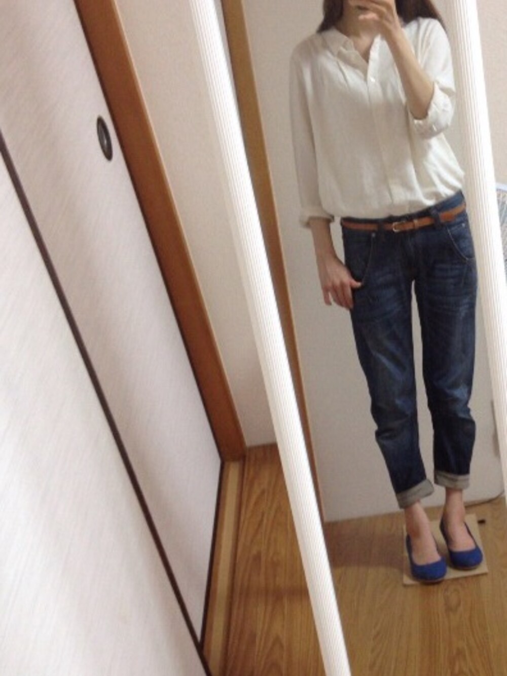 シンプルコーデなので、差し色で青のパンプスにしました^ - ^