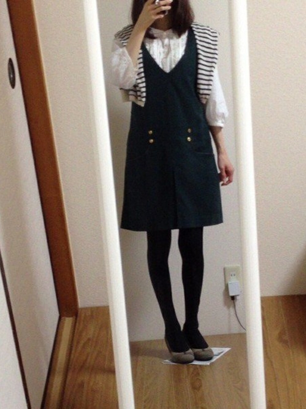 kmのワンピース「グリーンワンピ」を使ったコーディネート