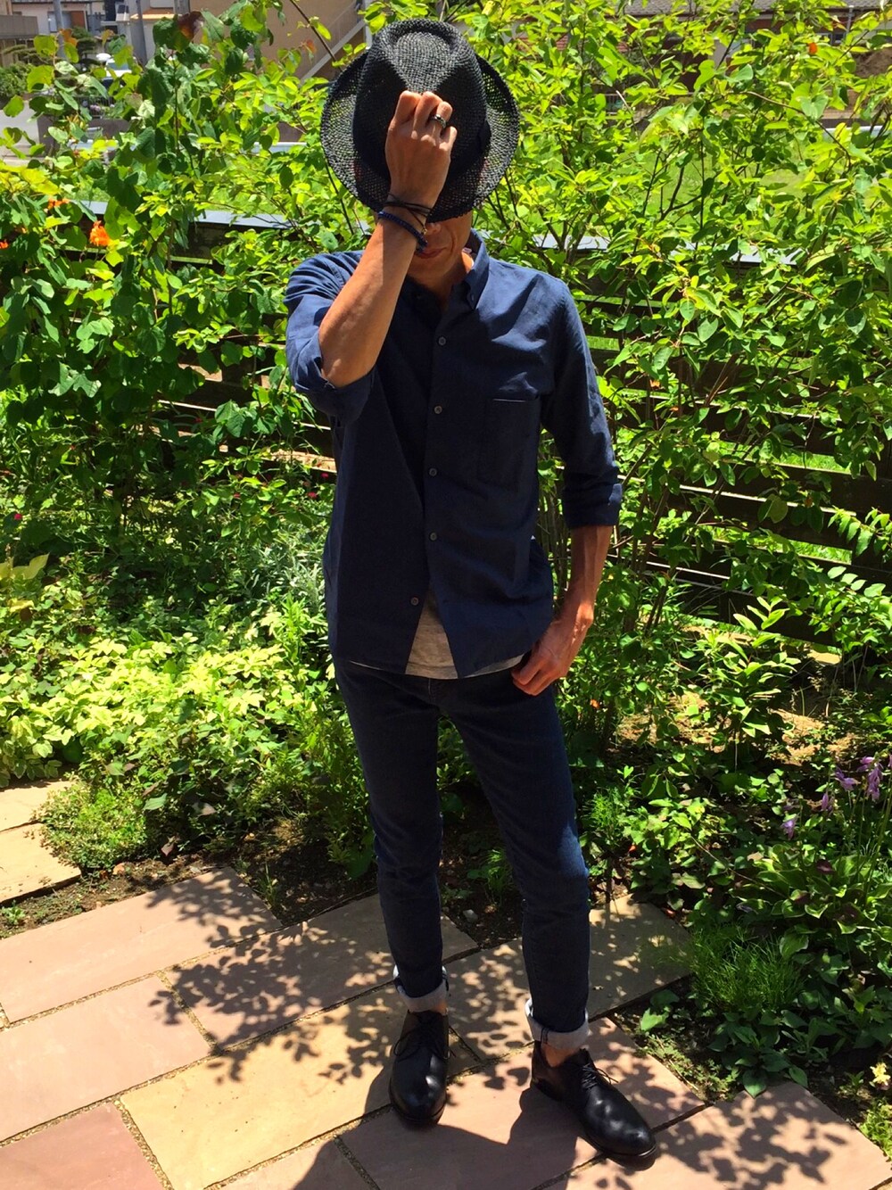 こんばんは。 シャツはネイビー、デニムはブラック。 白シャツの爽やかさと雰囲気違うところが いい。