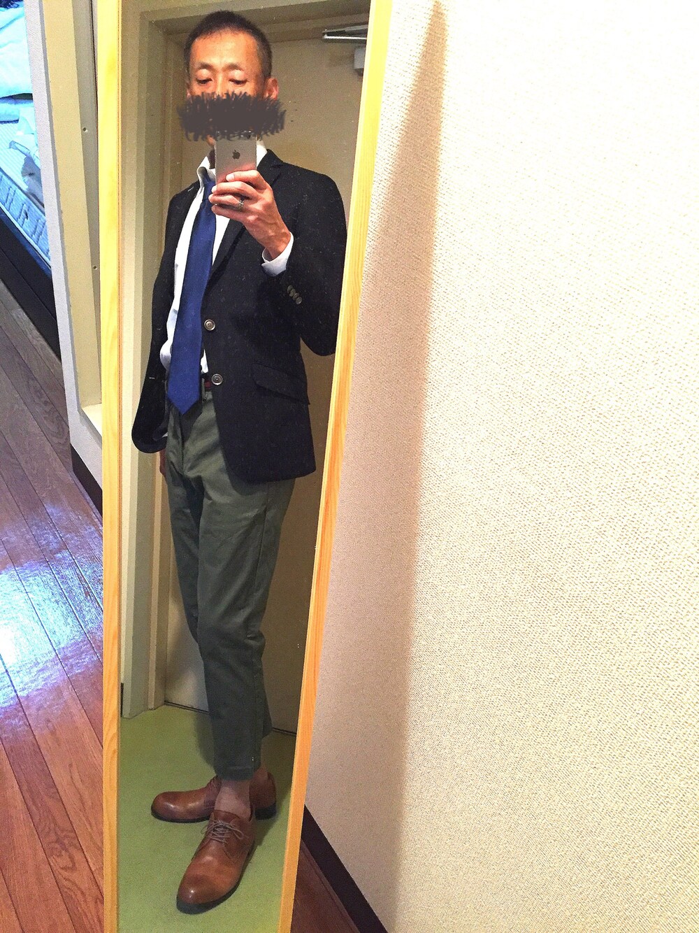 皆さん、こんばんは。 今回はジャケットとアンクルカットのチノパンを 合わせてみました。 パンツをスラックスに替えれば通勤コーデです。 ジャケパンは大人メンズコーデの鉄板ですね。