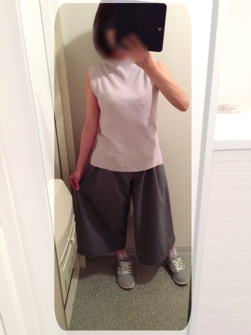 休日シンプルカジュアルコーデ トップスはラベンダー、パンツはグレーで落ち着いたカラーな分 グレーのスニーカーでカジュアルぽさをプラスしてみました