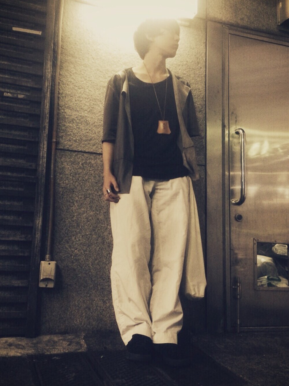 今日は珍しいbukhtのレザーカーディガンをメインのスタイリングです。 ダークブラウンのカラーをホワイトのワイドパンツで軽くし、そこに差し色としてブラックのカットソーをインナーに加えて落ち着いたトーンのスタイリングにしました。