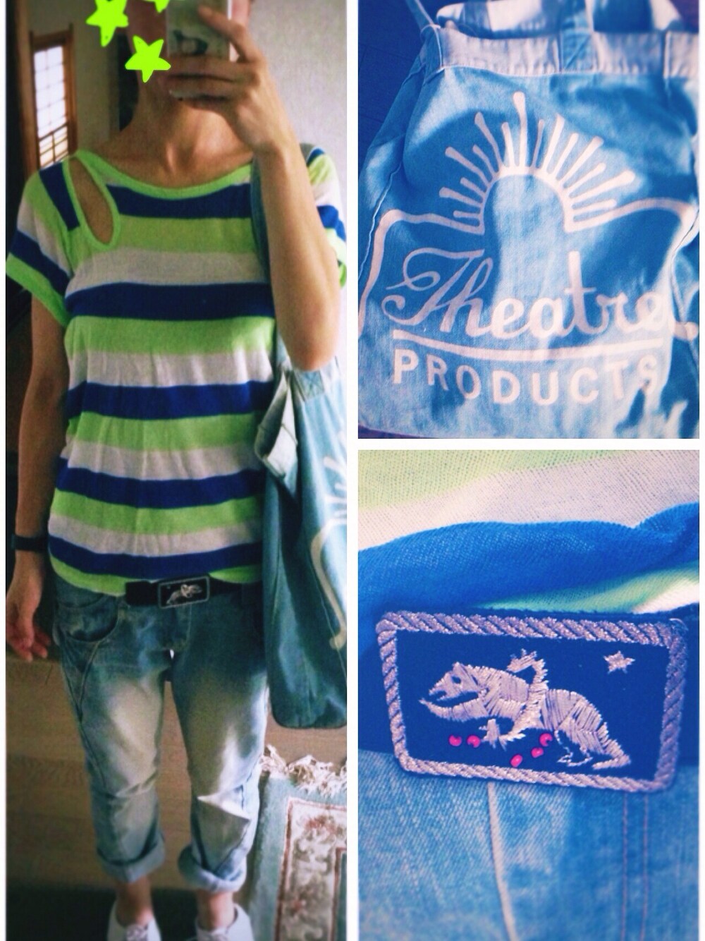 前後ろくり抜きデザインの派手ボーダーTシャツとベルトはズッカ。ベルトのクマかわいー シアターのロゴがあまりにも好きです♥︎