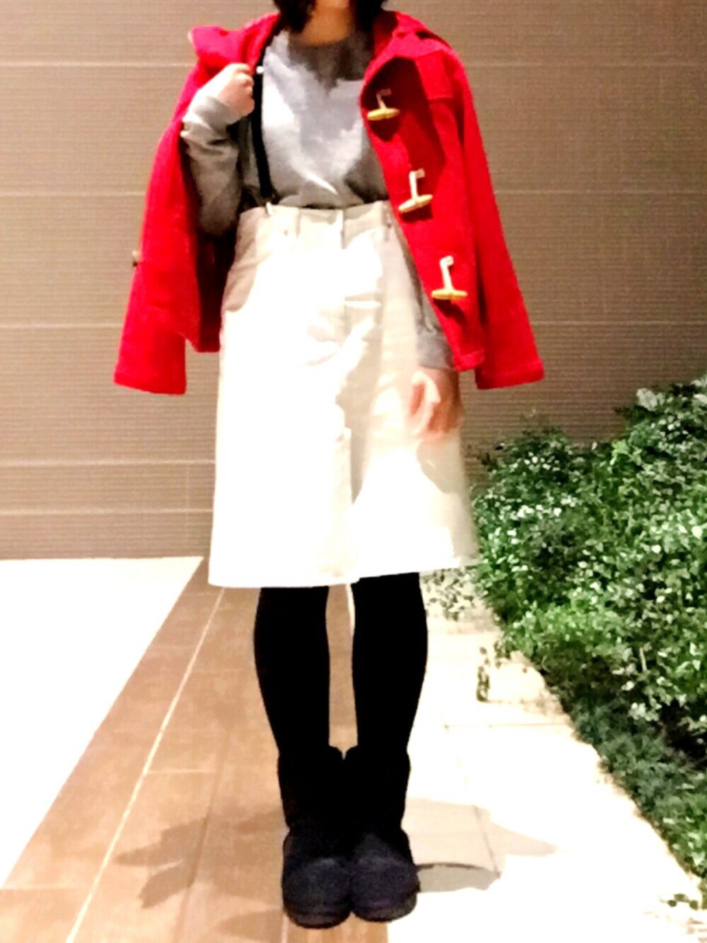 デニムのスカート第2弾👗 今回はWhiteです👏🏻✨ そして、やっぱりグレーを足してしまう、グレー好き🙈💓 赤いダッフルコートは、いとこからのおさがりです🙃🌷