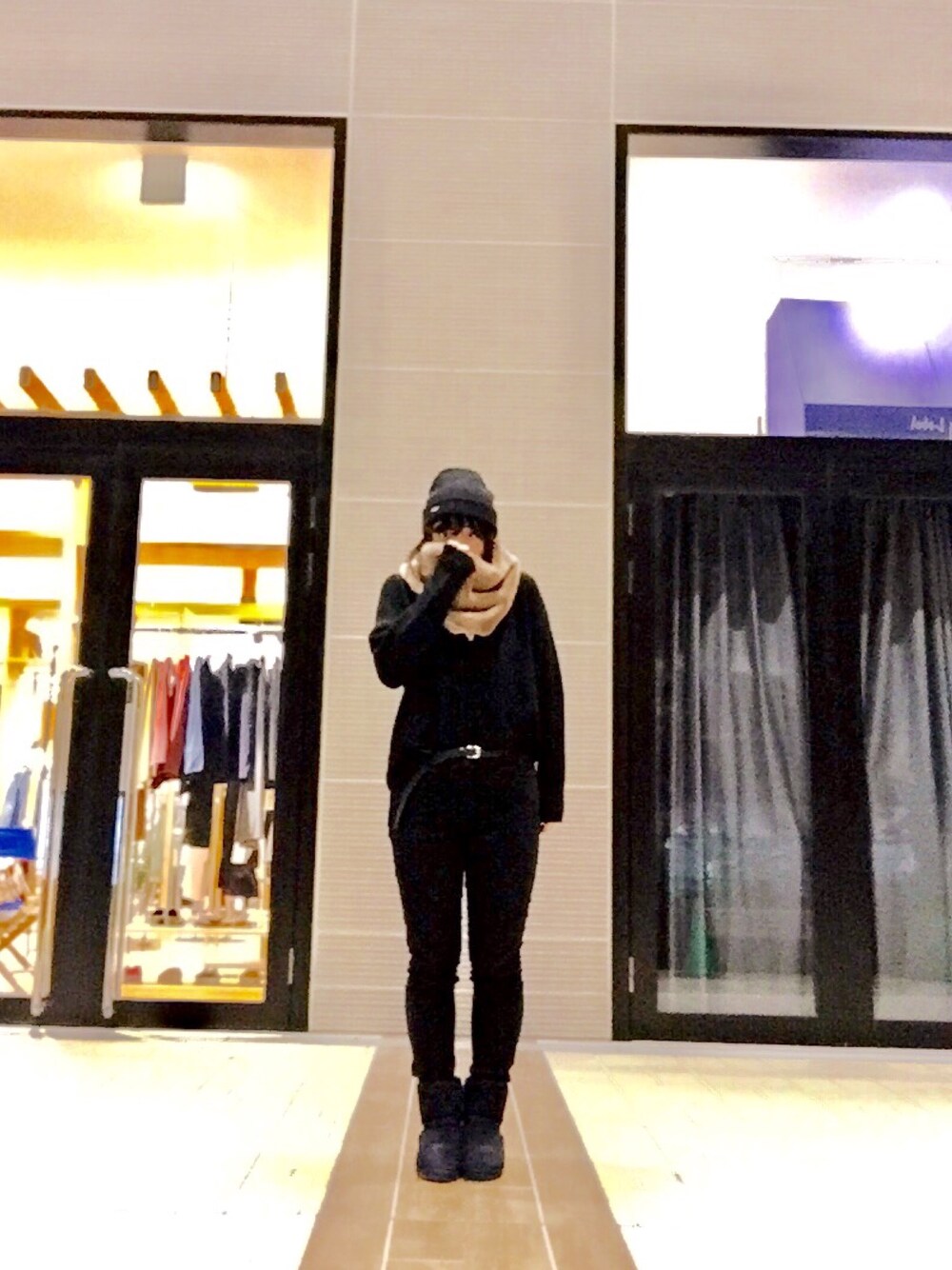 ブラックで攻めてみました🐶 けどちょっと黒すぎたかな笑 友達に喪服って言われちゃいました😂 でも、スヌード買えて大満足です^^ 今日も寒かったですね〜