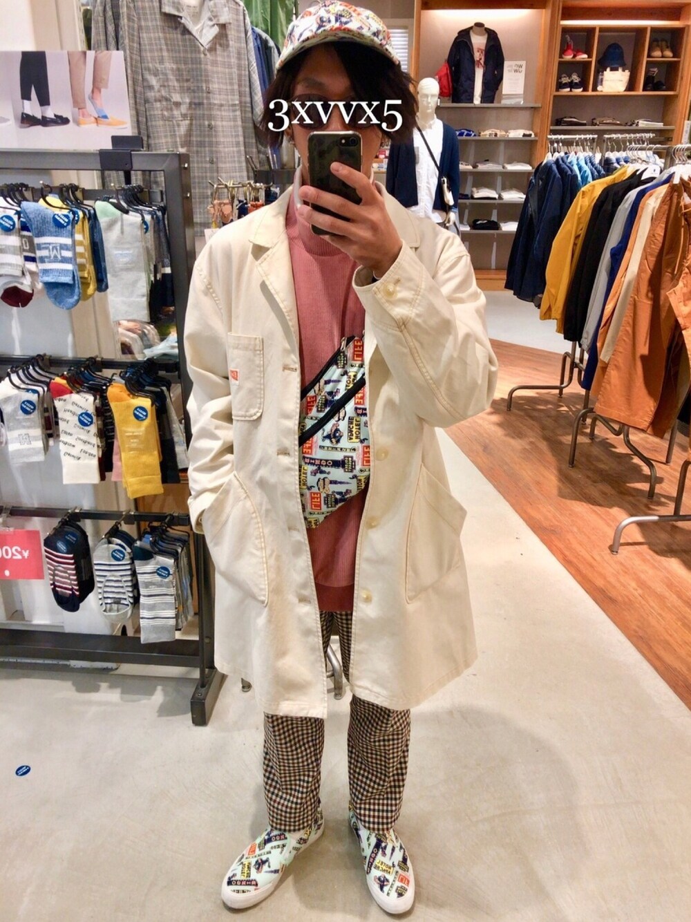 ショップコートを使用したコーデです💡 今回は白のショップコートをチョイスしました🧥 インナーにはピンクのモックネック、 パンツにはベージュのチェックパンツと春色のアイテムで全体的に明るいトーンでまとめました😄 小物は同じ柄で合わせて統一感を出しました👍