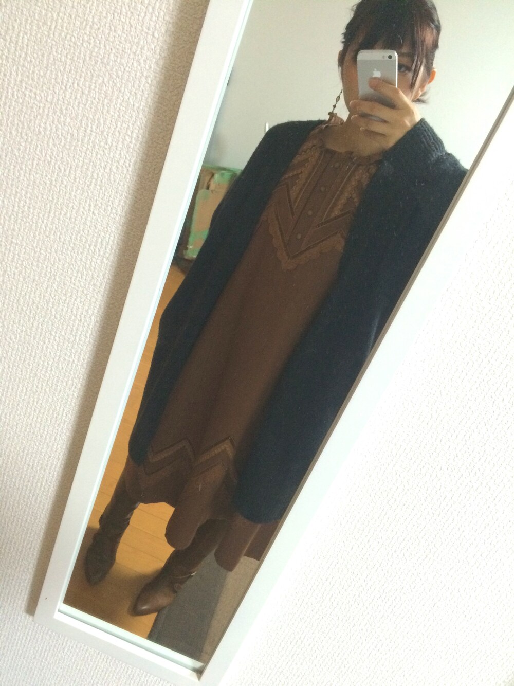 ワンピースは母からのお下がり。 ブーツも茶色、ピアスもブラウンのをつけて、全体的に茶色でまとめました。