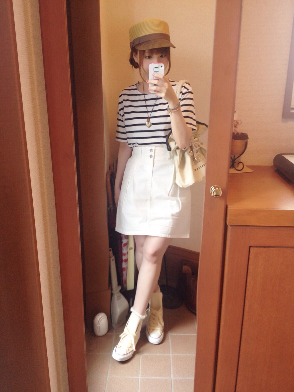 タグのマリンで、ホワイトをメインにボーダーと合わせたマリンコーデです( ´ ▽ ` )ノ 今回は、帽子とスニーカーでカジュアルめにしました☺︎☆★