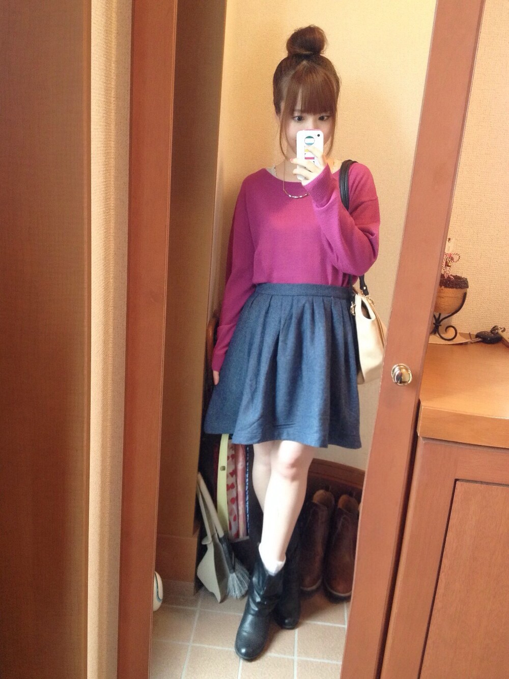 今回は少し先のお団子ヘアーのタグのコーデです( ´ ▽ ` )ノ濃いピンクのニットにネイビーのスカートを合わせて足元は黒のショートブーツで秋らしくしてみました☺︎♫ 髪型はタグのお団子です(*'ω'*)コテで巻いてからお団子作るとやりやすいです☆★