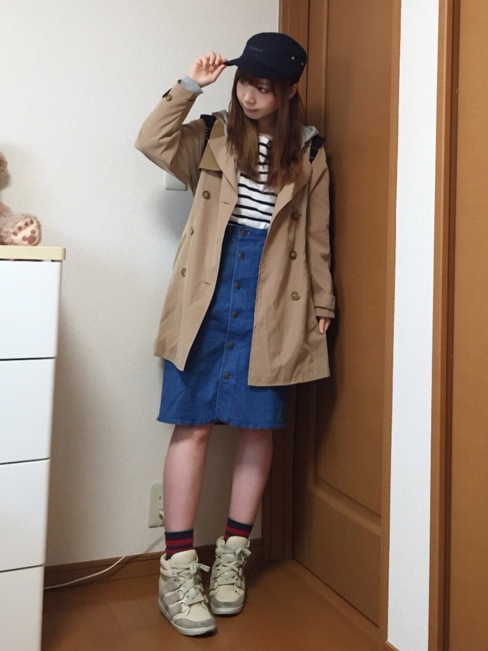 小物☆ キャップ...GLOBAL WORK スニーカー...Heather リュック...And A 今回はタグのベージュのトレンチコート、ボーダートップス、白いスニーカーを使ったコーデです( ´ ▽ ` )ノ トレンチにパーカーを中に着て、キャップとスニーカーでカジュアルにしました☆インナーはボーダートップスです☺︎ 髪型はストレートにしてキャップを被りました∩^ω^∩髪の色がだいぶ抜けてきてしまったので今週美容室に行く予定です♫ 小窓は先日maboちゃんことまりなちゃんと、よしのぶくんことよし君とご飯に行ってきました☆ よし君の声がけで三人集まることになったのです☺︎ 二人とは初対面でしたが楽しくお喋りできて楽しかったです(*'∀'*) まりなちゃんは色がとっても白くて可愛くて、よし君は思ったより身長が高くて爽やかで二人ともお洒落でした❤︎ ドレスコードは、 お団子 白いニット カモフラスカート 白のタイツ 黒のローファー 淡いロングコート でした☆