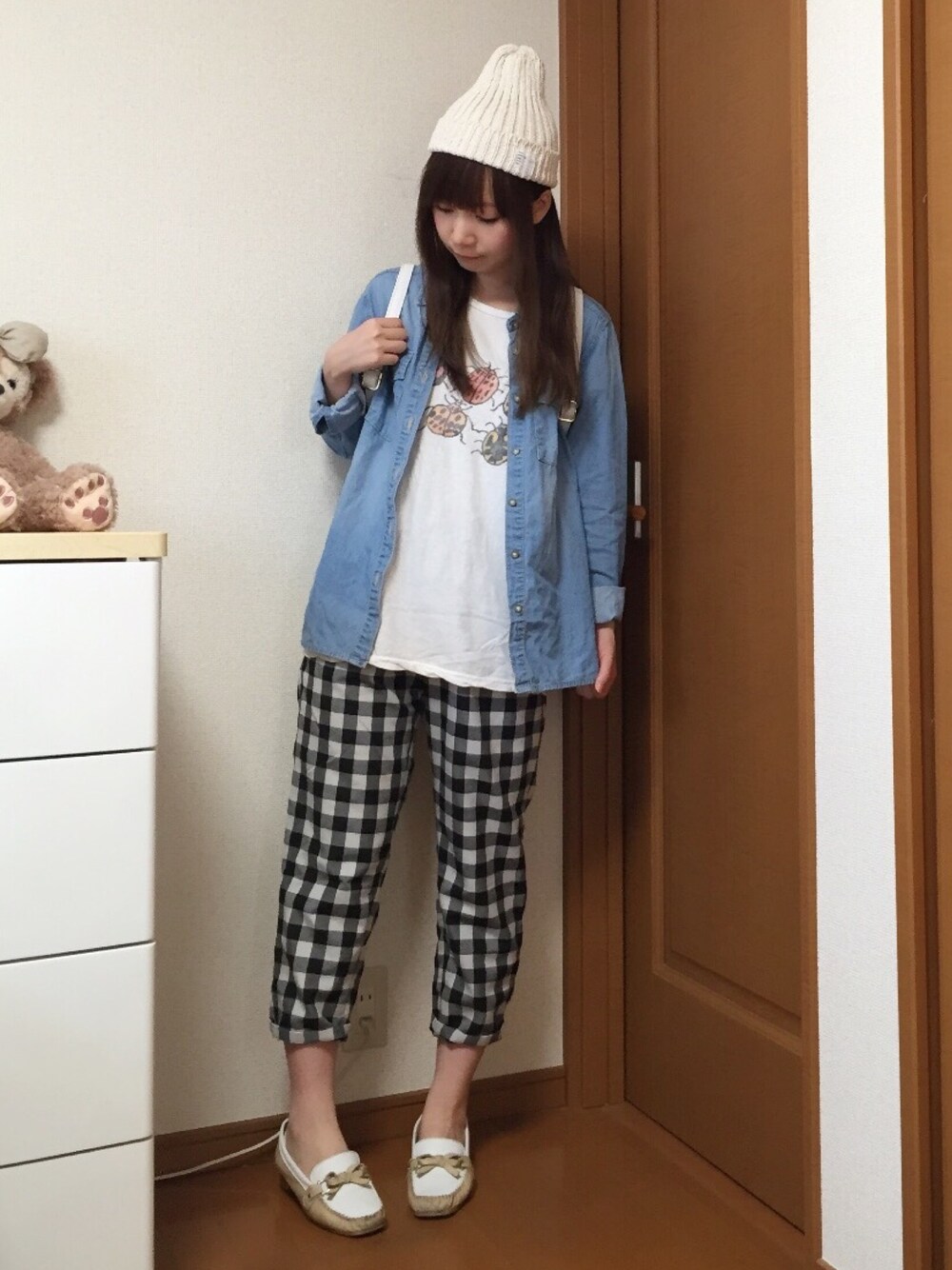 今回はデニムシャツとチェックパンツで合わせたコーデになります( ´ ▽ ` )ノ 古着屋さんで買ったTシャツにチェックパンツを合わせました☺︎ 見えにくいんですが、チェックパンツを少しロールアップして軽さを出しました☆デニムシャツの袖もロールアップしてます(* 'ω')ノ サマーニット帽とリュックと靴はホワイトでまとめました★ 髪型はストレートにニット帽被ったスタイルです∩^ω^∩ 本日はロールアップフェスとデニムファン感謝祭に参加させていただきます☺︎