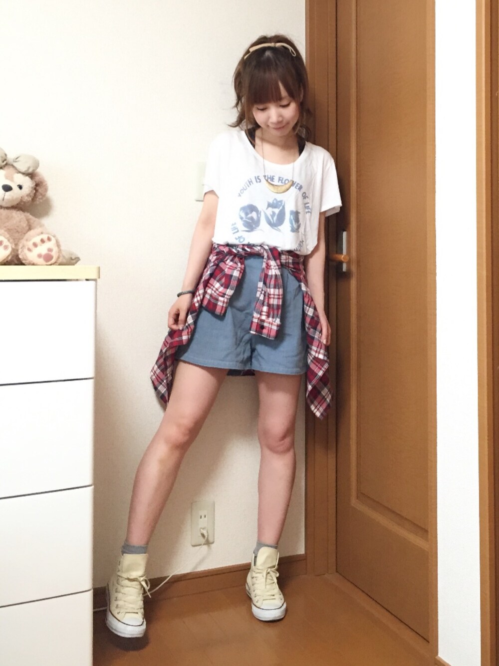 今回のコーデはタグコレのお気に入りのTシャツを使ったコーデです(*ノv`) このTシャツはすごく着やすくてシルエットも好きです☺︎ ショーパンと合わせてアクセントにチェックの腰巻きをしました☆ 髪型は高めの位置で結んだポニーテールです∩^ω^∩