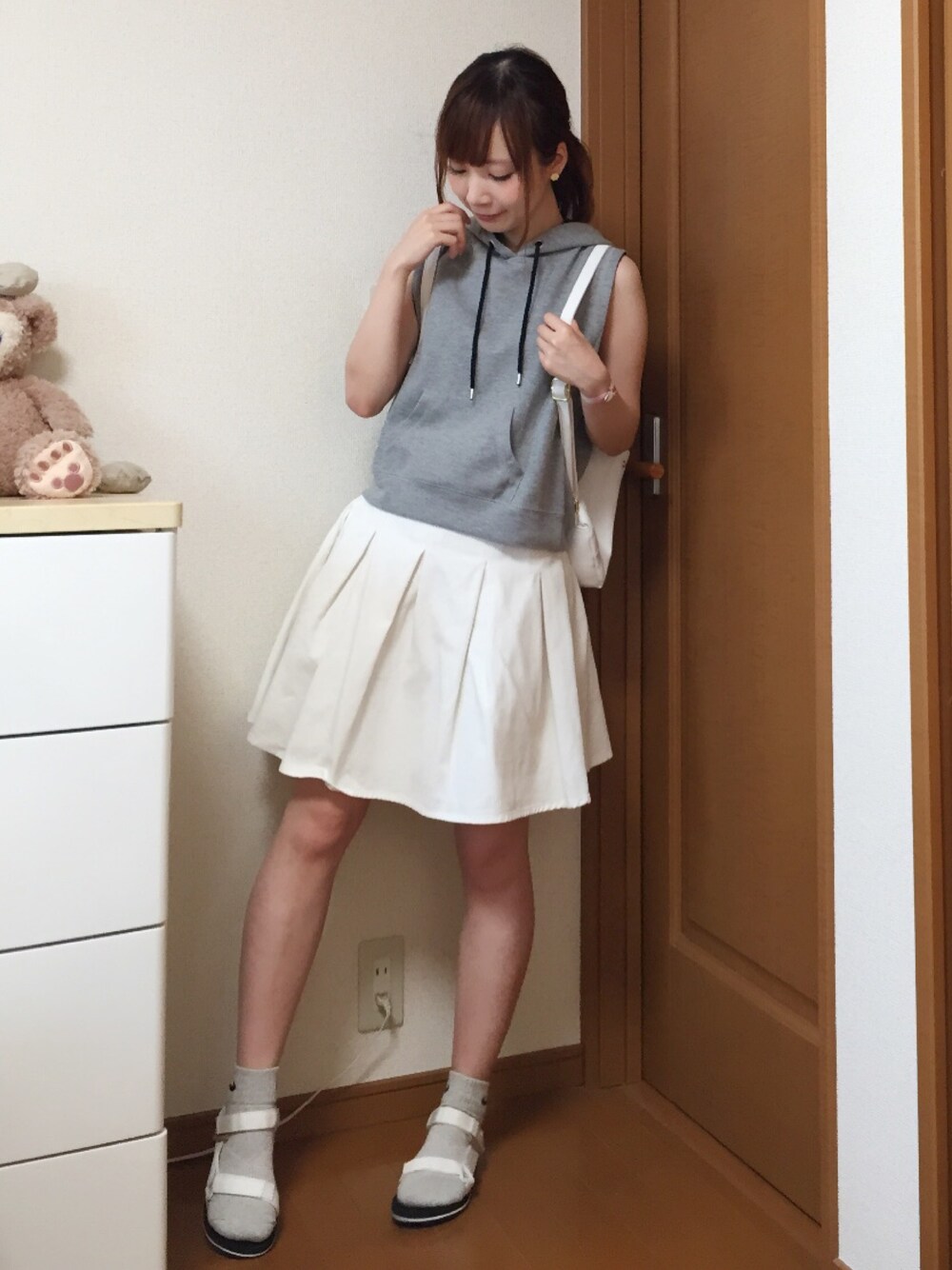 今回はノースリーブのパーカーを使ったコーデになります( ´ ▽ ` )ノ 白スカートを合わせて少しガーリーさもだしました☆ 足元は前回と全く同じなんですが、スポサンにナイキソックスです☺︎ 髪型は低い位置で後ろで結んでます∩^ω^∩ 見えずらいけどお花のピアスもアクセントでつけました★ 暑くて最近夏バテ気味です(;ω;)
