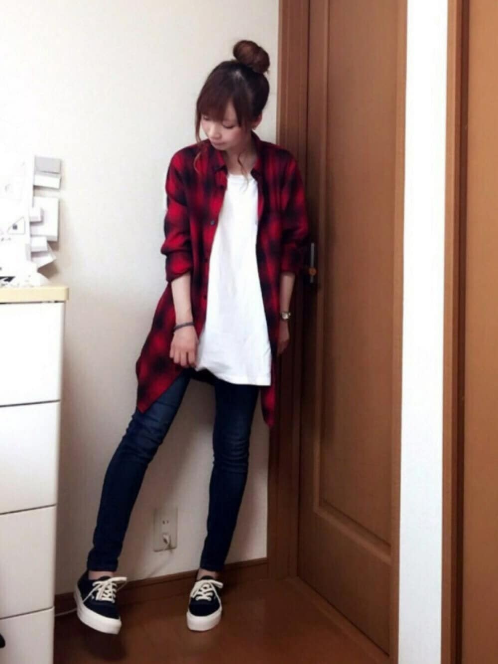 今回はチェックシャツと少し前に新しく買ったバンズのコーデです★ チェックシャツにスキニー合わせですっきりと☆ 足元はネイビーバンズです☺︎ 髪型はお団子にしました(*'ω'*)